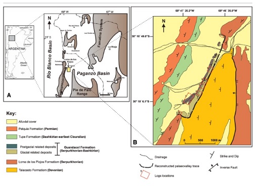 Fjord systems, represented by glacial diamictites and postglacial transgressive shales, formed in the basins of western Argentina during the late Carboniferous Gondwana glaciation. Well exposed fjord deposits of the Guandacol Formation were studied in the Loma de Los Piojos region (Protoprecordillera), where they fill a 2.9 km wide paleovalley with steep side walls and a relatively flat floor. The valley cross-cuts Lower Devonian sandstones and Mississippian mudstones and sandstones, and provides evidence of glacial abrasion, including striated pavements and glacial microtopography (grooves, ridges, and striae). Based on the analysis of seven sedimentary logs, eight sedimentary facies in the valley fill were recognized: (A) Massive diamictites; (B) Laminated mudstones with dropstones; (C) Stratified diamictites; (D) Clast-supported conglomerates and sandstones; (E) Deformed diamictites, conglomerates and sandstones; (F) Folded diamictites; (G) Mudstones interbedded with sandstones, and (H) Stacked and amalgamated sandstones. These sedimentary facies are grouped into two principal facies assemblages that represent different stages of the paleovalley fill. Assemblage 1 is composed of diamictites (Facies A, C and F), laminated mudstones with dropstones (Facies B), and conglomerates (Facies D and E), which represent glacially influenced sedimentation in the paleovalley. Assemblage 2 represents the paleovalley fill when glacial influence ceased, and comprises laminated mudstones interbedded with sandstones (facies G) and stacked sandstone beds (facies H) that mostly record deltaic sedimentation. Stratigraphic relationships, plant fossils found in the paleovalley walls and palynological assemblages recovered in mudstones of facies D help to establish an early Pennsylvanian age for both the incision and the filling of the paleovalley. The studied paleovalley records an exceptional example of the western Gondwanan glacial to postglacial transition. Due to the continuous stratigraphic succession within the paleovalley as well as palynological, megafloristic and radiometric data, this example provides a complete framework of the late Carboniferous postglacial evolution in western Gondwana.