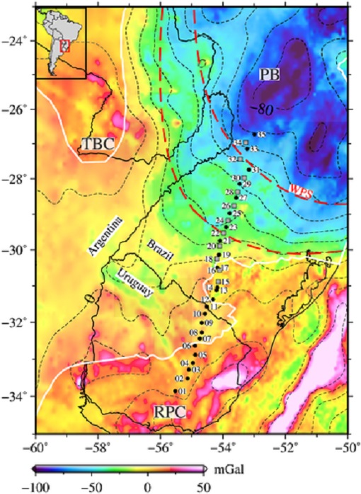 We conducted a magnetotelluric (MT) study from Paleoproterozoic Rio de la Plata Craton, in Uruguay, toward Paleozoic‐Mesozoic Paraná Basin, in Brazil. The 850‐km‐long MT transect comprises 35 evenly spaced broadband electromagnetic soundings sites. In the Paraná Basin, 11 additional long‐period measurements were acquired to extend the maximum depth of investigation. All data were inverted using two‐ and three‐dimensional approaches obtaining the electrical resistivity structure from the surface down to 200 km. The Rio de la Plata Craton is >200‐km thick and resistive (~2,000 Ωm). Its northern limit is electrically defined by a lithosphere scale lateral transition and lower crust conductive anomalies (1–10 Ωm) interpreted as a Paleoproterozoic suture at the southern edge of Rivera‐Taquarembó Block. The latter is characterized by an approximately 100‐km thick and moderate resistive (>500 Ωm) upper mantle. The Ibaré shear zone is another suture where an ocean‐ocean subduction generated the 120‐km thick and resistive (>1,000 Ωm) São Gabriel juvenile arc. Proceeding northward, a 70‐ to 80‐km thick, 150‐km wide, and inclined resistive zone is imaged. This zone could be remnant of an oceanic lithosphere or island arcs accreted at the southern border of Paraná Basin. The MT transect terminates within the southern Paraná Basin where a 150‐ to 200‐km‐thick less resistive lithosphere (<1,000 Ωm) may indicate refertilization processes during plate subduction and ocean closure in Neoproterozoic‐Cambrian time. Our MT data support a tectonic model of NNE–SSW convergence for this segment of SW Gondwanaland.