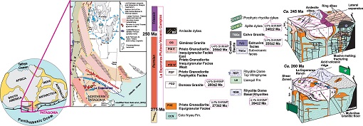 Two main lines of evidence disagree whether or not the Patagonian blocks collided with Gondwana. All models invoke the voluminous magmatism of the La Esperanza Complex as evidence for active subduction magmatic arc or to a postcollisional setting. The evolution of this bimodal igneous suite is reassessed with field, geochronological (SHRIMP U-Pb zircon and K-Ar mica) and petrophysical data. Emplacement of high-K calk-alkaline granitic magmas occurred at shallow crustal levels (2–8 ± 2 km depth) related to the development and collapse of a caldera associated with a regional NW-SE structural trend. Magmatism involved intermediate hybrid pulses at 273 ± 2 Ma and 255 ± 2 Ma (Prieto Granodiorite) that shifted like a yo-yo to acidic magmas at 260 ± 2 Ma and 250 ± 2 Ma (Donosa and Calvo granites). Absence of solid-state deformation features and the low anisotropy degrees in the granites indicate that its fabric is magmatic in origin. Magnetic fabric in granodiorites displays a concentrical pattern with subhorizontal foliations and lineations. Parallel to the volcanic axis, magnetic foliations and moderately plunging lineations indicate a common feeder system for plutonics and volcanics. Donosa Granite shows a discordant pattern with WNW-ESE ENE-WSW trending low plunging lineations and foliations. The plutono-volcanic system construction (273–255 Ma) followed NW-SE and NE-SW diamond shape faults trends and supracrustal discontinuities. Magmatic Climax is bracketed at 260 Ma. The collapse of the edifice is evidenced by the intrusion of acid magma plugs and dike swarms between 250 and 246 Ma. A similar age range was identified in other areas of Patagonia related to syn and postcollisional tectonic events. No evidence of tectonic activity such as major uplift, metamorphism or thrusting was found excepting regional strike-slip faulting and extension. Therefore, La Esperanza Complex is a high crustal level episode, and as such may not have structurally recorded an active collision during its crystallization and cooling.