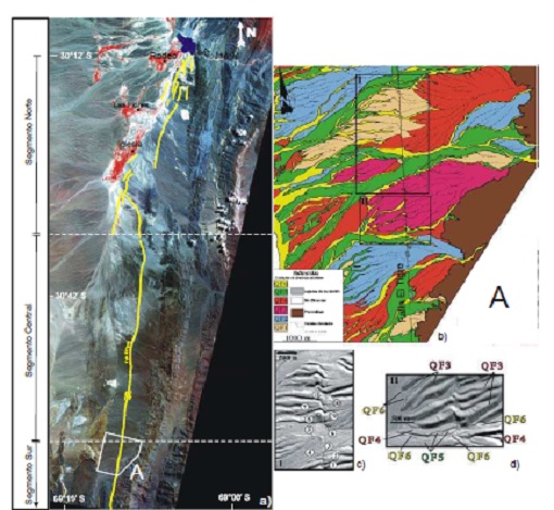 The present study has the characterization of the kinematics, structure and deformation of one of the most outstanding structural features in the Central-Western Precordillera of the San Juan province, the oblique-slip ‘El Tigre’ fault as it main objective. It is shown that the application and development of different geophysical methods, together with the usual geological studies as structural, geomorphological and stratigraphic analysis, allow to significantly extend the understanding of a zone affected by neotectonic activity. Different methods of geophysical study were applied with positive results in zones affected by the fault: shallow 2D Electrical Resistivity Tomography, Paleomagnetism and Anisotropy of Magnetic Susceptibility. Among the main achievements of the investigation we enumerate: the identification of discontinuities in the trace and landforms associated to strike-slip faulting, the recognition of structures oblique to the fault, the determination of smaller and larger trace curvatures, and the evaluation of the fault activity along time. In particular, in the Central Segment of the ‘El Tigre’ fault the 2D Electrical Resistivity Tomography revealed the underground features of sediments, the location and orientation of the main fault, the structure of pressure-ridges and sag-ponds, and allowed to relate the landforms distribution to the largest changes in the fault trace orientation. Besides, this methodology allowed to suggest the existence of blind faults and grabens, the location of the water table and the recognition of the ‘El Tigre’ fault as a hydrogeological barrier. Paleomagnetic studies were essential for: detection of the presence of zones with important tectonic rotations around vertical axes associated to the fault motion, differences in the fault activity in different geological periods and, considering the oblique structures revealed in the cartographic study, helped to propose a preliminary kinematic scheme of rigid-block deformation. The method of Anisotropy of Magnetic Susceptibility showed the maximum and minimum shortening directions of the deformation, and a possible variation of them with time.