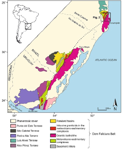 The Dom Feliciano Belt developed during the Brasiliano–Pan-African orogenic cycle due to the tectonic interaction between the Rio de la Plata, Congo and Kalahari cratons, along with the amalgamation of smaller continental fragments. Together with its prolongations to the south, the Major Gercino Shear Zone constitutes one of the main lineaments of the orogenic system, establishing a more than 1000 km long NE-trending tectonic boundary between a granitic batholith and a metavolcano-sedimentary association. Based on combined field, structural, microstructural and textural data, together with new and published geochronological data, a refined model for the geological evolution of the Major Gercino Shear Zone is presented. Regional NW-verging, low-dipping structures were generated between 650 and 615 Ma, preceding the formation of the shear zone. This was followed by the main deformation phase, corresponding to pure-shear dominated dextral strike-slip, interpreted do be controlled by regional transpression during oblique convergence of the continental terranes. This stage lasted until ca. 585 Ma and was coeval with the continuous emplacement of granitic magmatism along the structure. Strain partitioning and localization led to the development of mylonitic belts along the intrusion borders mostly under greenschist facies metamorphic conditions. Late-stage ductile deformation along the structure was active during the cooling of the intrusions until ca. 550 Ma, while the deformation front of the orogenic system migrated to counterpart orogenic belts in the African continent. After tectonic stabilization, the Major Gercino Shear Zone recorded episodic brittle reactivation, possibly related to the Phanerozoic evolution of the active margins and intracratonic basins in Gondwana.