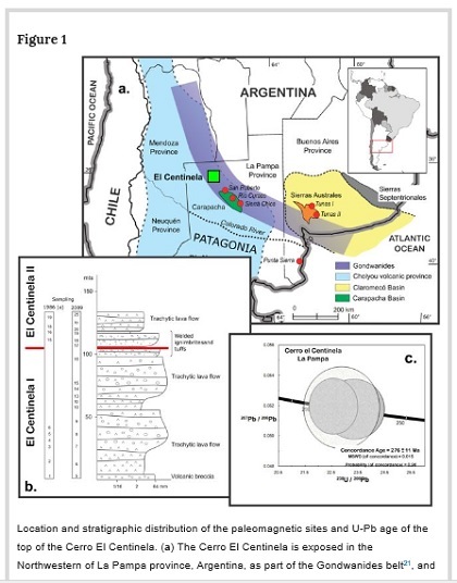 A long-standing debate regarding the configuration of Pangea during the Late Paleozoic has been going on among the paleomagnetic community concerning the validity of one of two significantly different Pangea reconstructions (Pangea A vs Pangea B) since the proposal of Pangea B. Although, Pangea B avoids any continental overlap marring classical Pangea A configuration (Wegener’s type), it requires a Carboniferous-Permian megashear of up to 1500 km to achieve the pre-Jurassic configuration. The existence of this megashear is controversial and has led to a wide range of hypotheses, in order to avoid Pangea A continental overlaps and consequently the need for major intra-Pangea movements and to accommodate the paleomagnetic database within a Pangea A reconstruction. We present paleomagnetic results from Permian volcanic rocks of the El Centinela, La Pampa, Argentina. Undeformed volcanic rocks are not affected by any inclination bias and are, therefore, ideal to test different paleogeographic models. The presence of two different paleopole positions, at the base and the top of the same stratigraphic sequence, makes this location optimal to constrain the track of the Gondwana’s path during the Late Paleozoic, which shows the transition from Pangea B during the Carboniferous-Permian, to Pangea A at the Permian – Triassic boundary.