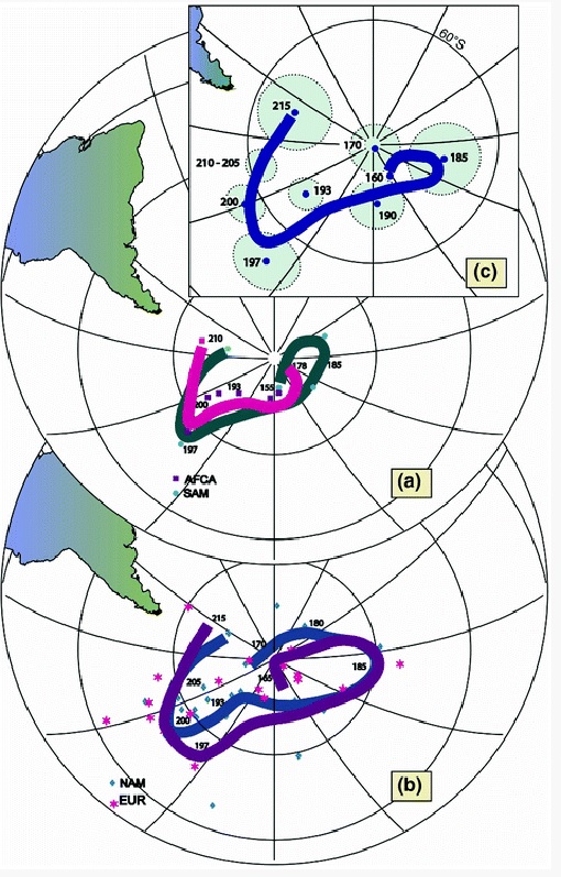 For decades, it has been interpreted that South America had remained stationary in similar present-day latitudes during most of the Mesozoic and the Cenozoic. More recent paleomagnetic data however, suggest a thoroughly different scenario for the Jurassic. In order to test the stationary vs. the dynamic—continent model, a refined Jurassic South American apparent polar wander path was constructed and compared with those from Eurasia, Africa, and North America. Similarities are such that a master path for Pangea is proposed. This path shows remarkable different polar positions during the Early Jurassic that are interpreted to have been caused by true polar wander. An absolute paleogeographical reconstruction of Pangea is presented. Paleolatitudes changes are very well sustained by paleoclimatic proxies from the southern and northern hemispheres.