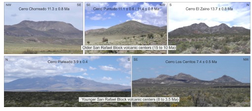 A series of mesosilicic volcanic centers have been studied on the San Rafael Block (SRB), 300 km to the east of the present-day volcanic arc. K-Ar ages indicate that this magmatic activity was developed in at least two stages: the older volcanic centers (∼15–10 Ma) are located in the central and westernmost part of the SRB (around 36°S and 69°W) and the younger centers (8–3.5 Ma) are located in an eastern position (around 36°S and 69°30′W) with respect to the older group. These volcanic rocks have andesitic to dacitic compositions and correspond to a high-K calc-alkaline sequence as shown by their SiO2, K2O and FeO/MgO contents. Elevated Ba/La, Ba/Ta and La/Ta ratios show an arc-like signature, and primitive mantle normalized trace element diagrams show typical depletions of high field strength elements (HFSE) relative to large ion lithophile elements (LILE). Rare earth element (REE) patterns suggest pyroxene and amphibole crystallization. Geochemical data obtained for SRB volcanic rocks support the proposal for a shallow subduction zone for the latest Miocene between 34°30″–37°S. Regionally, SRB volcanism is associated with a mid-Miocene to early Pliocene eastward arc migration caused by the shallowing of the subducting slab in the South-Central Andes at these latitudes, which represents the evolution of the Payenia shallow subduction segment. Overall, middle Miocene to early Pliocene volcanism located in the Payenia back-arc shows evidence for the influence of slab-related components. The younger (8–3.5 Ma) San Rafael volcanic rocks indicate the maximum slab shallowing and the easternmost extent of slab influence in the back-arc.