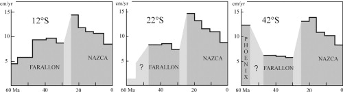 The Andean Cordillera has evolved since the Late Cretaceous in the context of subduction of oceanic lithosphere beneath continental lithosphere, making the kinematics between South America and its adjacent oceanic plates in the Pacific basin valuable to analyze the development of the Andean orogen. The latest Cretaceous–Cenozoic convergence history in western South America may be divided into three stages. The youngest Stage 1 (25–0 Ma) is characterized by ENE directed convergence of the Nazca plate toward most of South America, and by ~ E–W subduction of the Antarctic plate beneath southern Patagonia. The Nazca–South America convergence rate in Stage 1 shows a continuous decrease from the highest values in the Cenozoic (~ 15 cm/yr) to the present day values from GPS measurements (~ 7 cm/yr). Stage 2 (47–28 Ma) is characterized by NE directed subduction of Farallon with the convergence rate remaining almost constant during the entire interval. In those times obliquity was dextral in Chile, sinistral in southern Peru, while almost head-on convergence occurred in central and northern Peru. During latest Cretaceous to Early Eocene times (Stage 3) the Farallon plate was subducted beneath Perú and the Phoenix plate was subducted farther south, where a triple junction migrated southward along the Chilean margin. The subduction of the Farallon plate was rather slow with variable direction imposed by the position of the triple junction, whereas subduction of the Phoenix plate was rapid (> 10 cm/yr) and ESE directed. We present a working hypothesis suggesting no major changes in the age of subducted lithosphere in the Chile trench from Middle Eocene to Late Oligocene, followed by subduction of progressively older oceanic lithosphere in the early Neogene and progressively younger lithosphere during the late Neogene and the Quaternary. In addition, it is shown that South American motion as predicted by available hotspot models has insufficient resolution to be applied to the analysis of Cenozoic Andean deformation.
