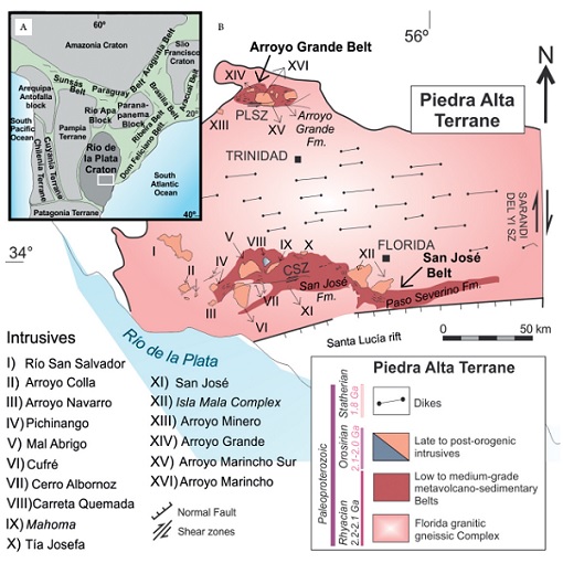 Small to medium-sized intrusive bodies with ages between 2.1 and 2.0 Ga characterize Piedra Alta terrane and represent the final stabilization of Río de la Plata Craton. A reconnaissance study of petro- and magnetic fabrics based on microscopic observations, anisotropy of magnetic susceptibility and anhysteretic remanent magnetization, was carried out on 41 sites from 14 intrusive bodies, in order to obtain preliminary information on kinematics of their emplacement, degree of deformation, and regional stress regime during this magmatic event. The magnetic fabrics coupled with the microstructural analysis are interpreted as generally reflecting magma kinematics near solidus temperature, although few cases of tectonically modified fabrics at local levels have been interpreted. Field evidence and magnetic fabrics in most plutons show subvertical to high angle E-W to NE-SW trending foliations and subvertical lineations. These data suggest that plutons were probably intruded under a regional extensional to transtensional regime, which controlled the magma ascent and distribution of the intrusions. Lack of metamorphism and low to null deformation shown by the study plutons suggest a late-orogenic character for this magmatism, which has been associated with crustal stabilization after accretionary processes that led to the formation of Río de la Plata Craton in the Orosirian.