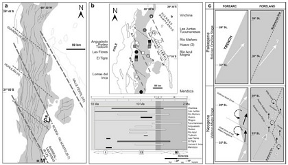 La base de datos paleomagnéticos disponible para el segmento de losa plana Pampeano revela un patrón de rotaciones heterogéneo como resultado de la sobreimposición de zonas de cizalla frágil-dúctiles regionales, de desplazamiento lateral izquierdo y rumbo NNO a ONO, las que habrían producido además la curvatura del margen continental.