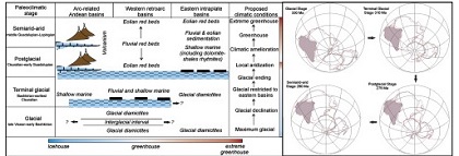 This paper provides a review of the Late Mississippian to Permian paleoclimatic history for southern South America based on lithologic indicators, biostratigraphic information, and chronostratigraphic data. The region is divided into three major types of basins: 1. Eastern intraplate basins (e.g., Paraná Basin), 2. Western retroarc basins (e.g., Paganzo Basin) and 3. Western arc-related basins (e.g., Río Blanco Basin). Four major types of paleoclimatic stages are recognized in these basins: 1. glacial (late Visean–early Bashkirian), 2. terminal glacial (Bashkirian–earliest Cisuralian) 3. postglacial (Cisuralian–early Guadalupian), and 4. semiarid–arid (late Guadalupian–Lopingian). The glacial stage began in the late Visean and continued until the latest Serpukhovian or early Bashkirian in almost all of the basins in southern South America. During the Bashkirian–earliest Cisuralian (terminal glacial stage), glacial deposits disappeared almost completely in the western retroarc basins (e.g., Paganzo Basin) but glaciation persisted in the eastern basins (e.g., Paraná and Sauce Grande Basins). A gradual climatic amelioration (postglacial stage) began to occur during the earliest Permian when glacial deposits completely disappeared across all of South America. During this interval, glacial diamictites were replaced by thick coal beds in the Paraná Basin while north–south climatic belts began to be delineated in the western basins, which were likely controlled by the distribution of mountain belts along the Panthalassan Margin of South America. Towards the late Permian, climatic belts became less evident and semiarid or arid conditions dominated in the southern South America basins. Eolian dunes, playa lake deposits, and mixed eolian–fluvial sequences occur in the Paraná Basin and in the western retroarc basins. Volcanism and volcaniclastic sedimentation dominated along the western margin of South America at that time. The stratigraphic record obtained in southern South America supports a long duration transition from icehouse to extreme greenhouse conditions.