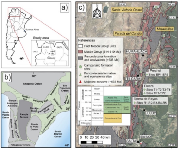 Paleomagnetic, magnetic fabric and rock magnetic studies were carried out in the late Middle to early Late Cambrian Campanario Formation exposed in NW Argentina. The study also presents preliminary results from the Early Cambrian metasediments of the Puncoviscana Formation and from Mojotoro intrusive. A new paleomagnetic pole, C2, was computed for the Campanario Formation (23.6°N, 346.5°E, A95, 7.0°, N: 11 sites) from the localities of Tilcara (T), Terma de Reyes (R) and El Perchel (EP), including previous data from Santa Victoria Oeste (M), in northernmost Argentina. A positive fold test was obtained for Tilcara locality while a positive regional tilt test was obtained for mean site directions for the four localities. This pole can be considered as the representative pole position for the Pampia terrane for the late Middle to Late Cambrian. Previous paleomagnetic data for the same formation from the Iruya-Matancillas locality show an in situ clockwise rotation of about 30° around a vertical axis when compared with the mean Pampia pole. The same is observed when comparing the early Ordovician pole for the Santa Rosita Formation at those localities with the recently obtained coeval pole of the La Pedrera Formation, indicating that local tectonic rotations, affected that area. These results suggest that previous paleomagnetic interpretations for these Late Cambrian and Early Ordovician rocks in the region as recording displacement of the Pampia terrane in Cambrian times are probably incorrect. Additionally, two virtual geomagnetic poles were computed for the Puncoviscana Formation (TP1: 34.5°N, 52.3°E, A95: 5.0°, n: 22 specimens and TP2: 38.3°N, 33.6°E, A95: 5.7°, n: 14 specimens) and one for the Mojotoro Intrusive (MO: 9.1°N, 345.6°E, A95: 16.4°, n: 11 specimens). These and previous Early Cambrian paleomagnetic data from the Pampia terrane differ from Gondwana coeval reference directions in inclination and/or declination, lacking a simple pattern.