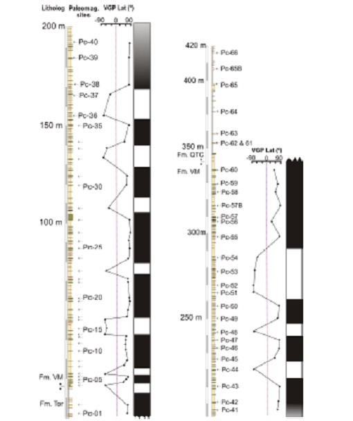 A systematic paleomagnetic study was carried out in the Vaca Muerta Formation, a carbonate- ramp system cropping out in the Neuquén basin, west-central Argentina. The Vaca Muerta Formation is one of the most important unconventional hydrocarbon reservoirs in the world and its exhaustive study has become a relevant target in Argentina. In the Puerta Curaco section, this unit is c. 360 m – thick bearing ammonites that indicate Upper Jurassic – Lower Cretaceous ages. Here, paleomagnetic sites were sampled from which nearly 500 specimens were collected and processed. The primary origin of the magnetization was proved through paleomagnetic field tests. As a result, a preliminary magnetostratigraphic scale was constructed dated with ammonites of the Andean Realm, and then correlated to the most recent International Geomagnetic Polarity Time Scale. The resultant magnetostratigraphic scale proved to be consistent with other studies, and allowed the refinement of the temporal framework of the lower part of the Vaca Muerta Formation. Simultaneously, in order to determine the main magnetic carriers of the magnetic remanence several rock magnetism studies were carried out such as isothermal remanent magnetization (IRM) acquisition curves, thermomagnetic curves and K vs. field curves that were complemented with observations of magnetic minerals under reflected light and scanning electron microscopy. Keywords: Vaca Muerta Formation, magnetostratigraphy, magnetic mineralogy, Neuquén basin