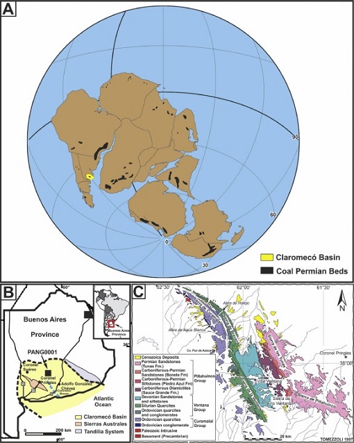 The PANG0001 well, situated in the Claromecó Basin, Argentina, involves rocks that belong to the Tunas Formation [29], Permian of Gondwana. It is composed of fine to medium sandstones intercalating with black and green mudrocks and three coal seams up to 3 m thick. In the coals, a petrographic analysis was carried out to analyze the depositional environment and the diagenesis level reached by the Tunas Formation. The coals are composed of mono-maceral bands of Collotelinite and Gelinite, from the Vitrinite Group, or Fusinite, from the Inertinite Group. They were deposited in a wet swampy forest with rises and decreases of the phreatic level. The presence of inertinite or charcoal evidence the occurrence of palaeo-fires during the Permian. The vitrinite reflectance values are between 1.3% and 2.38%. The coals classify as semiantracitic to low volatile bituminous, with 10 to 25% of volatile matter. The vitrinite reflectance values indicate temperatures between 140 °C and 190 °C. The Tunas Formation reaches the oil to methane gas window, into a catagenesis to metagenesis range related to the organic matter diagenesis. Coal petrography is a good method for the environment and diagenesis analyses applied to the Tunas Formation.