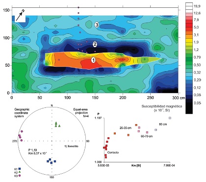 Alrededor de uno de los xenolitos se observa un halo desmagnetizado que se interpreta como debido a una