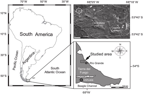 The steppe of northern Tierra del Fuego is an important region for studying climate variability in the Southern Hemisphere, due to its position at the southern margin of the Southern Hemisphere Westerly Wind belt. Here we present a multiproxy analysis of a sedimentary sequence from Laguna Carmen (53°S, 68°W) which provides evidence of the progressive aridity and strengthening of the low-level Westerlies during the Late Holocene. We identified three prominent phases in the climatic record from Laguna Carmen: a cold and wet period between ~4000 cal. BP and ~2200 cal. BP, evidenced by a relative high lake level, periodic runoff into the lake, and oligohaline (mean: 2554 μS/cm) salinities; a step-change towards warmer and drier conditions after ~2200 cal. BP, reflected by limited runoff and oligo-mesohaline salinities (mean: 4799 μS/cm); and finally, the establishment of modern semi-arid conditions some time after ~1000 cal. BP, when the lake became a shallow lake that sometimes dried out during the summer. Our results coincide with paleoclimatic numerical models that suggest a progressive aridification of the southern Patagonian steppe since 6000 cal. BP due to stronger Westerlies and higher temperatures associated with changes in solar irradiance.
