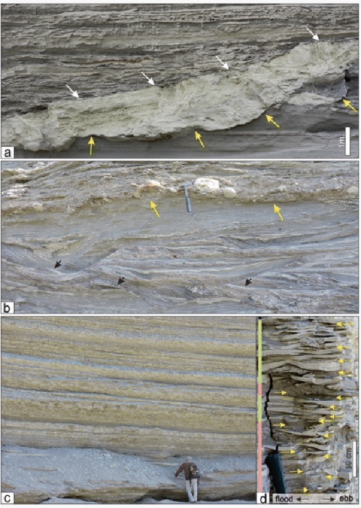 The late Miocene beds of the Puerto Madryn Formation (Provincia del Chubut, Argentina) are formed by shallow marine and estuarine sediments. The latter include several tidal-channel infills well exposed on the cliffy coast of the Peninsula Valdés. The Bahía Punta Fósil and Cerro Olazábal paleochannels are end members of these tidal channels and show a fining-upward infilling starting with intraformational channel lag conglomerates above deeply erosional surfaces interpreted as fluvial ravinement surfaces (the erosion surface formed in the purely fluvial or the fluvially dominated part of the estuary, where erosion is driven by fluvial processes). These are overlain and eventually truncated (and suppressed) by the tidal ravinement surface (TRS), in turn covered with high-energy, bioclastic conglomerates mostly formed in the “tidally dominated/fluvially influenced” part of an estuary. Above, large straight or arcuate point bars with alternatively sandy/muddy seasonal beds and varying trace and body fossil contents were deposited from the freshwater fluvially dominated to saline-water tidally dominated part of the estuary. The upper channel infill is formed by cross-bedded sands with mud drapes and seaward-directed paleocurrents, together with barren, volcaniclastic sandy to muddy heterolithic seasonal rhythmites, both deposited in the fluvially dominated part of the estuary. Volcanic ash driven by the rivers after large explosive volcanic eruptions on land resulted in sedimentation rates as high as 0.9 m per year, preserving (through burial) the morphology of tidal channels and TRSs. The channel deposits were formed in a tide-dominated, macrotidal to hypertidal open estuary with well-developed TRSs resulting from strong tidal currents deeply scouring into the transgressive filling of the channels and eventually cutting the fluvial ravinement surface. The TRSs extended upstream to the inner part of the estuary during long periods of low sedimentation rates, extended channel migration and sediment bypass, interrupted by transient, high volcaniclastic input. The tidal channels of the Puerto Madryn Formation constitute a unique example of estuary sedimentation with pulsed sediment supply in a macrotidal to hypertidal estuary.