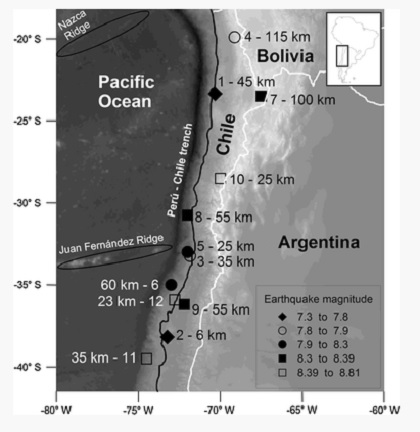 In this work, we consider historical earthquakes registered in Chile (from 1900 up to 2010) with epicenters located between 19 and 40°S latitude, in order to evaluate the probabilities of the occurrence of strong earthquakes along Chile in the near future. Applying Gumbel’s technique of first asymptotic distribution, Wemelsfelder’s theory and Gutenberg–Richter relationship, we estimate that during the next decade strong earthquakes with Richter magnitudes larger than 8.7–8.9 could occur along Chile. According to our analysis, probabilities for the occurrence of such a strong earthquake range between 64 and 46% respectively. Particularly in the very well known “seismic gap” of Arica, a convergence motion between Nazca and South American plates of 77–78 mm/year represents more than 10 m of displacement accumulated since the last big interplate subduction earthquake in this area over 134 years ago. Therefore, this area already has the potential for an earthquake of magnitude >8.