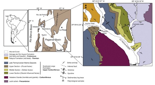 A new locality where Carboniferous glacial diamictite appears confined to paleovalleys is described in the north of the Argentinian Precordillera. The glacial deposits of the lower part of the Carboniferous Quebrada Larga Formation are divided in three stratigraphic intervals, all of them confined to a paleovalley carved into the granitic and high-grade metamorphic basement. The lower section is composed of different types of massive and stratified diamictite interpreted to record reworking of previously deposited poorly sorted glacial sediments. The middle section comprises shale with dropstones, lenticular beds of diamictite and large-scale cross-bedded sets of sandstone and conglomerate. These rocks represent a more advanced stage of deglaciation that comprises the following succeeding steps: 1) amelioration of the climatic conditions, melting of glaciers, fluvial erosion, 2) the formation of a water body (onset of the fjord system) and 3) a later progradation of Gilbert-type deltas. Diamictite is missing in the upper section, which is chiefly formed by cross-bedded sandstone and conglomerate deposited in braided fluvial plains. A quantitative analysis of palynological assemblages through the sequence allowed a reconstruction of the dynamics of the vegetation developed during the filling of the paleovalley. The presence of monosaccate pollen grains supports an age not older than Serpukhovian and the recognition of the characteristic species of the Raistrickia densa–Convolutispora muriornata Biozone reinforces a late Serpukhovian–Bashkirian age for the assemblages.