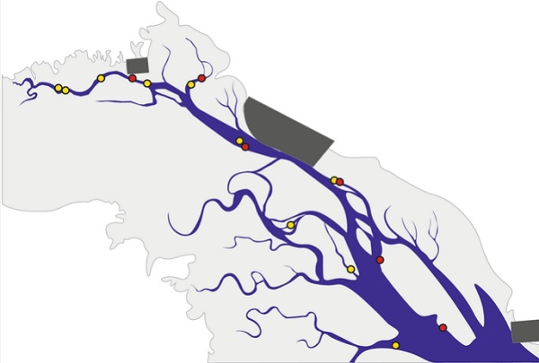 Abstract: The macrobenthic communities in the soft-bottom subtidal areas of the Bahía Blanca Estuary are dominated by polychaetes, crustaceans, and mollusks. Species richness, abundance, biomass, and taxonomic and functional diversity of the macrobenthic communities vary between the myxohaline and euhaline zones. These biological descriptors of the macrobenthic communities also vary between zones located near urban and industrial effluent discharges compared to those located farther away. For the whole area studied, 155 morphospecies are listed, with dominance of the polychaetes Nicolea sp. and Leodamas verax in the myxohaline zone, Terebellides totae in the middle zone, and Axiothella sp. and the bivalve Corbula patagonica in the euhaline zone. Also, the polychaete Laeonereis acuta was dominant in the vicinity of sewage discharges. Most organisms are deposit-feeders and lack calcified bodies. There are more small-sized (<1 cm), discretely motile and burrowing organisms in the myxohaline zone than in the euhaline zone, which has more medium-sized (1–5 cm) and motile organisms. The ecological role of burrowing and deposit-feeding organisms, such as bioturbators, potentially promoting the bioavailability of contaminating substances, is highlighted throughout the chapter. There are several sources of anthropogenic disturbance, presumably acting synergistically and cumulatively. Based on the macrobenthic community, the affected areas are detected near sewage and industrial discharges. The inner area of the Bahía Blanca Estuary shows greater environmental sensitivity with the highest anthropogenic pressure.