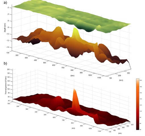 en 2-D de mapas magnéticos y estima la profundidad del punto de Curie, el gradiente geotérmico